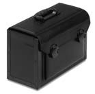 Натуральная кожа, черная, с накатанной мереей. Чемодан, усиленный алюминиевыми уголками, на ножках, с карманом, петли, инструментодержатели на передней и задней стенке для инструментов диаметром соответственно до Ø 16/26 мм.